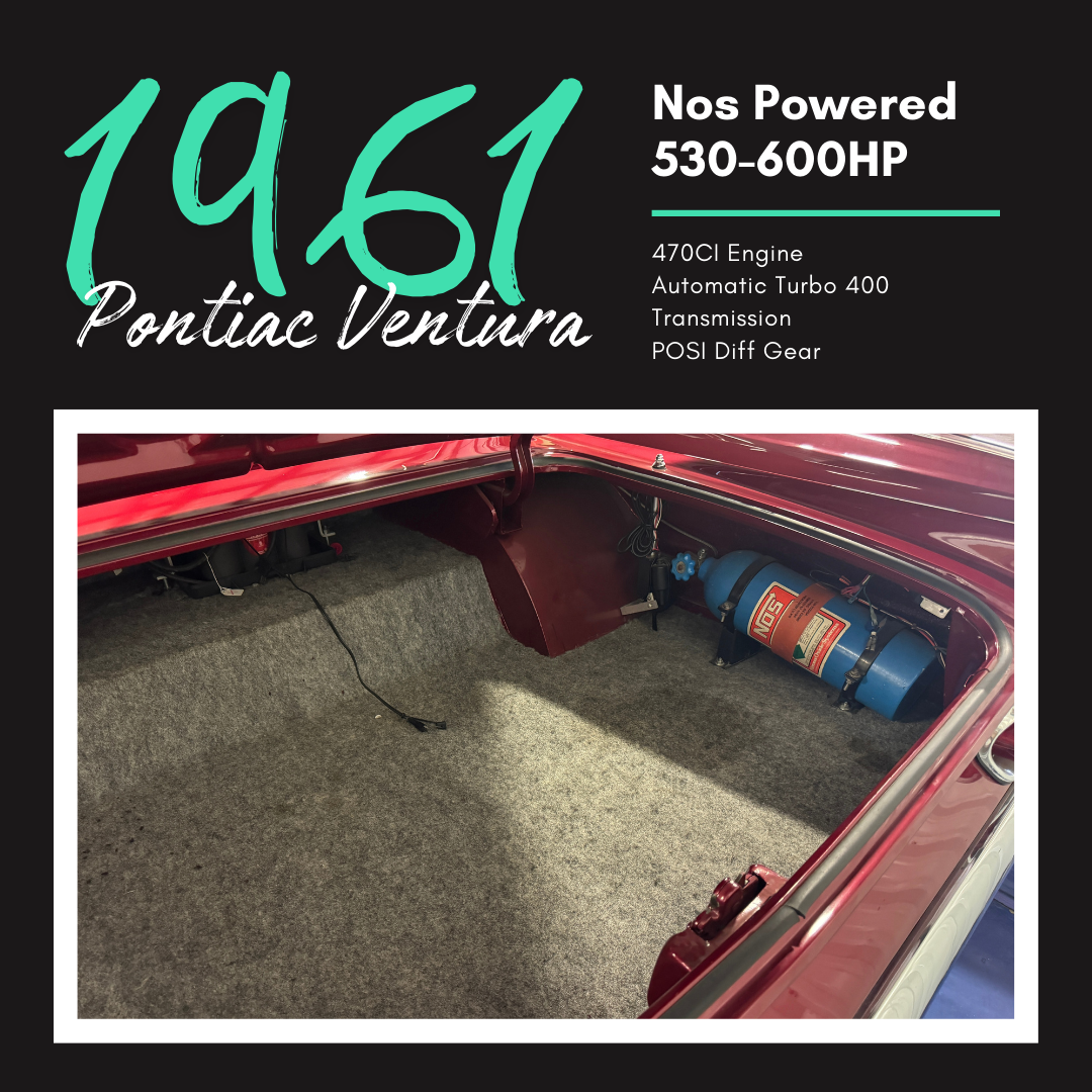 This exquisite 1961 Pontiac Ventura truly stands out as a remarkable and extraordinary model within its class. The excitement surrounding this Pontiac Ventura is undeniable, thanks to its Nos-powered, 470CI engine that delivers an impressive 520-600hp. And with the custom signature from the iconic Jim Wangers, this vehicle is guaranteed to capture attention and turn heads wherever it goes.